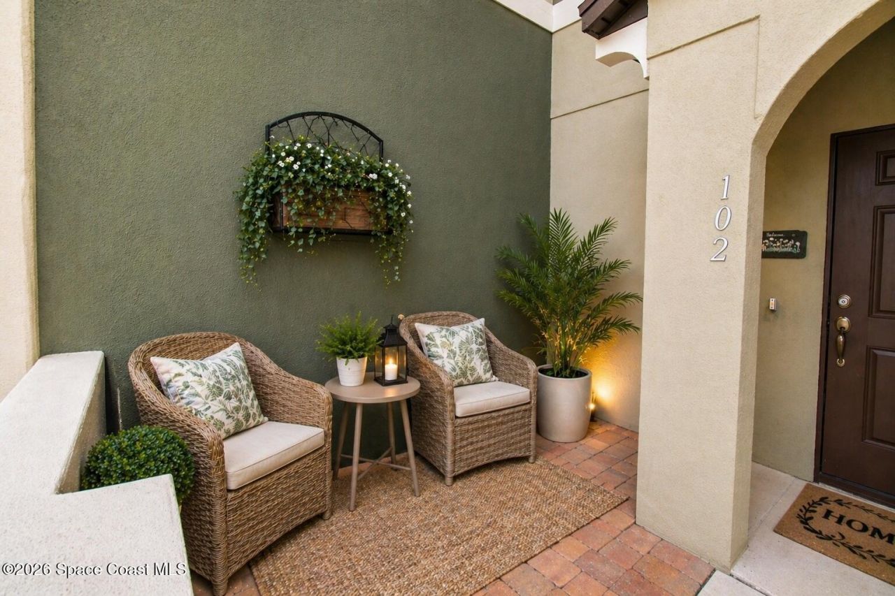 This townhouse was Built in 2020. This is not one of the original properties. A truly maintenance-free impeccably maintained that feels like a brand new home. The HOA covers ROOF REPLACEMENT, EXTERIOR PAINTING, CABLE, INTERNET, LAWN CARE, sprinkler maintenance, and exterior insurance, giving you effortless, low-maintenance living.The entire home has been professionally painted, with an epoxy coating added to the garage floor, new custom lighting throughout, and a security camera system installed.This home is located in the beautiful and convenient Meadow Pointe community of Rockledge, Florida, just 5 minutes away from VIERA. Featuring 3 bedrooms, 2.5 bathrooms, and a 1-car garage, and filled with tasteful upgrades throughout you will definitely be impressed.As you arrive, youll appreciate the side-by-side driveway space and oversized one-car garage. A charming front porch, tucked behind a quaint aluminum gate, provides the perfect spot to relax and watch the neighborhood come to to life.Inside, youre welcomed by 36-inch tile planks and high ceilings, creating an open and airy feel, ideal for showcasing a statement chandelier. The kitchen impresses with a large island topped with granite countertops, custom pendant lighting, stainless appliances, and 42-inch cabinets with under- and over-cabinet lighting.The spacious family room flows seamlessly into the adjacent breakfast nook and features sliding glass doors leading to a large fenced-in travertine patio. The backyard offers a rare oversized outdoor space, perfect for entertaining, relaxing, or playing with the kids.A beautiful staircase with white-and-wood accent laminate leads to the upper level. The primary suite is generously sized and features a large walk-in shower, dual vanities, and a spacious walk-in closet.The garage includes a 6 x 4 storage area with additional shelving and cabinets, providing excellent storage solutions.This home is conveniently located near I-95 and US-1, just 20 minutes from the beaches, 30 minutes from Kennedy Space Center, and 45 minutes from Orlando, offering both convenience and an exceptional Florida lifestyle.